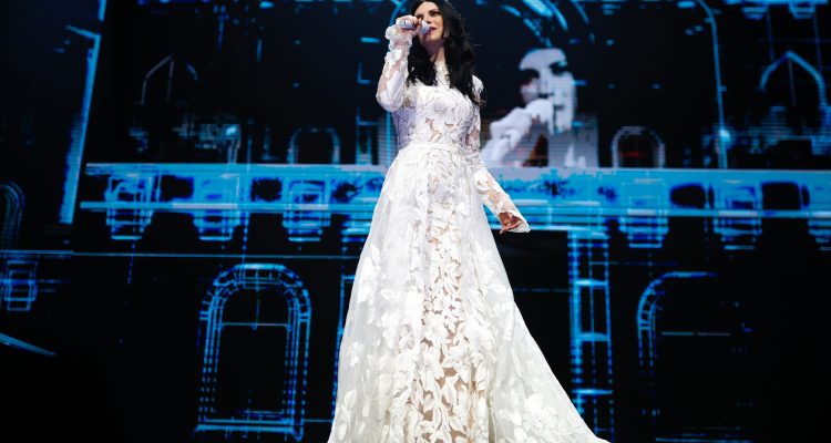 A tres décadas de su triunfo en el Festival de San Remo con “La Solitudine”, la oriunda de Faenza llegó con la premisa de homenajear a los compositores cuyas canciones marcaron su vida. Así surgió una magistral puesta en escena de “Hijo de la Luna” (Mecano), donde la italiana apareció coronada de estrellas y cargando la figura de un bebé dorado entre sus brazos, bajo una atmósfera de luces blanquecinas. Tras una interpretación impecable de “Entre tú y mil mares”, el show giró hacia los setenta con “Porque te vas”, de José Luis Perales, aunque esta vez reinventada bajo un inesperado código de reguetón.